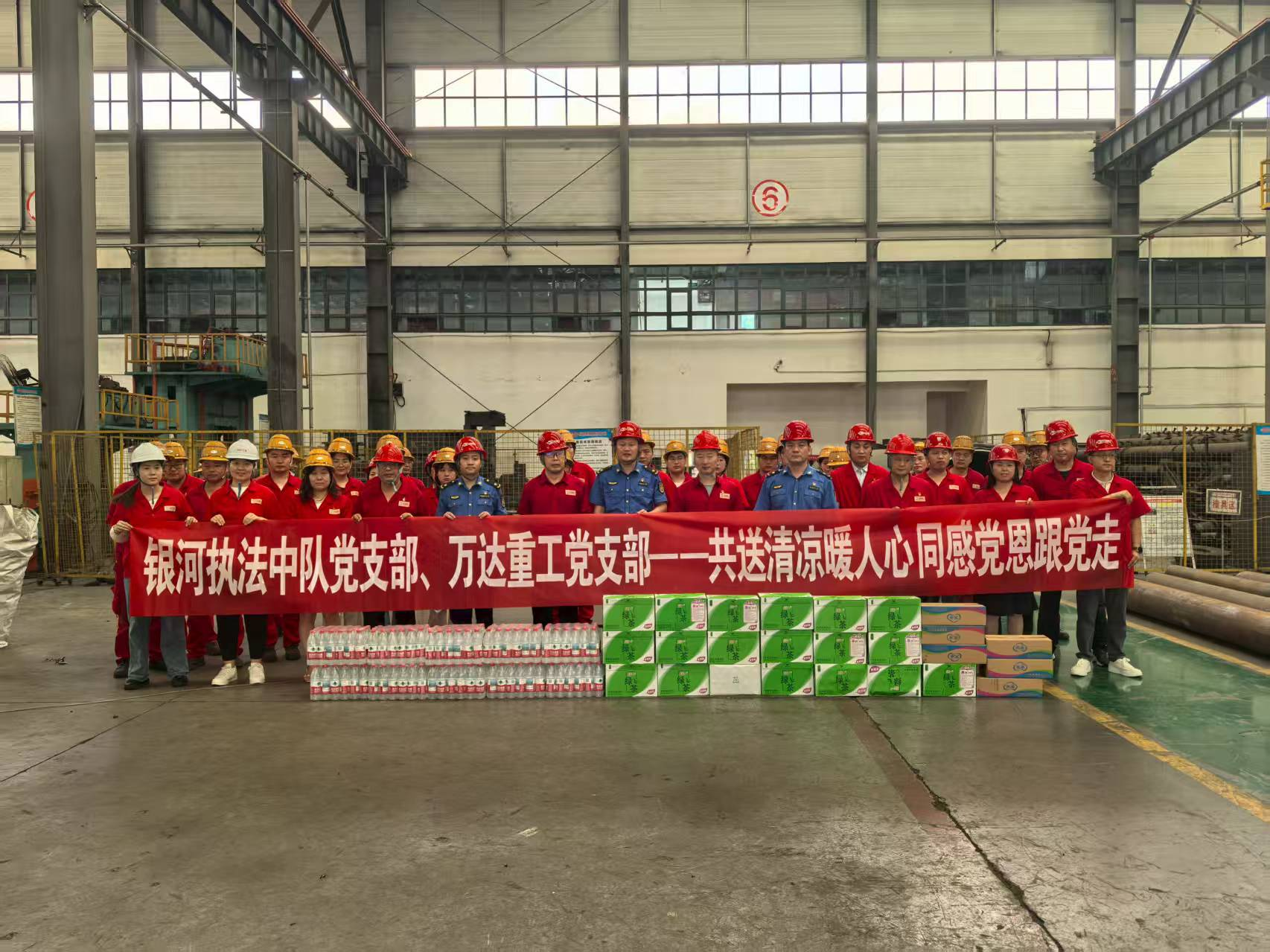万达重工党支部活动情况:一、7月9日中午,银河执法中队党支部与万达重工党支部携手走进万达重工生产车间,开展“共送清凉暖人心,同感党恩跟党走”活动,为一线员工赠送冰糕、绿茶和矿泉水等物品。此活动在顶端新闻“郑州市航空港区银河办事处官方账号”上发布。