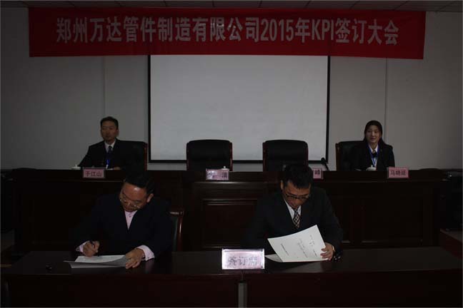 郑州万达管件制造有限公司2015年KPI签订会于1月30号在公司行政区会议室隆重举行,公司班长以上所有管理人员参加了此次签订会议。签订会分为三级签订,即:董事长与总经理签订、总经理与公司各高管签订、公司各高管与分管的各部门负责人签订,近期,各部门负责人将部门的KPI指标进行分解,与各班组及相关岗位签订目标责任书,达到“千斤重担人人挑,人人肩上有指标”的责任分解领受,确保最终顺利完成公司2015年度各项任务和目标。
