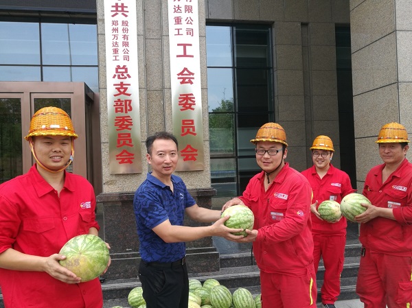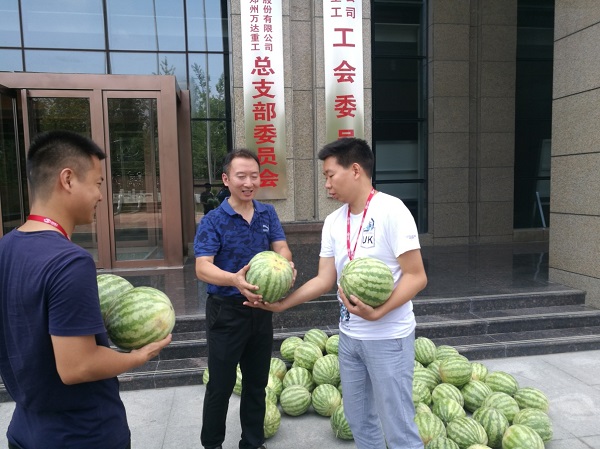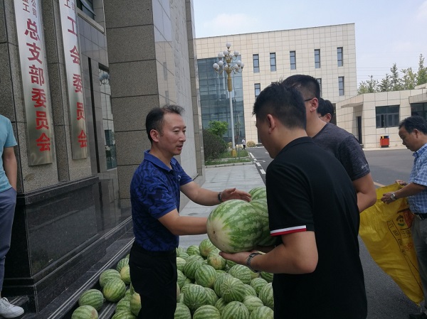 工会主席于江山在发放西瓜中提醒大家高温季节要做好自我调节,防止高温中暑,同时叮嘱相关负责人要落实好防暑降温工作,根据实际情况合理安排作业、劳动强度,确保一线员工生产安全和身体健康。