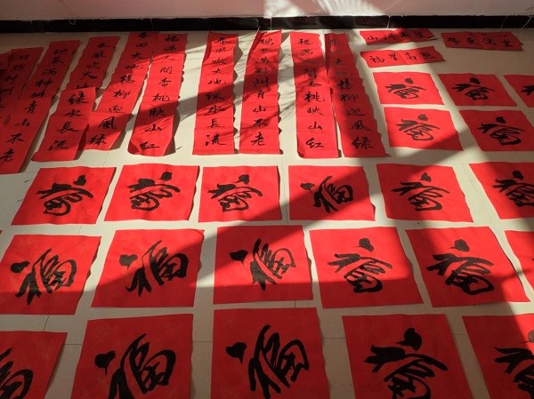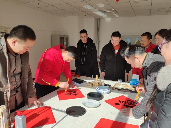 当天中午,在工会主席于江山的带领下,股份公司书法爱好者王英豪、刘松桥、靳奎、梁启超、张珊珊等人在书画阅览室摆开书案,摊开红纸,挥毫泼墨,写福字、写对联,红彤彤的福字和对联将现场点缀出浓浓的年味儿。
