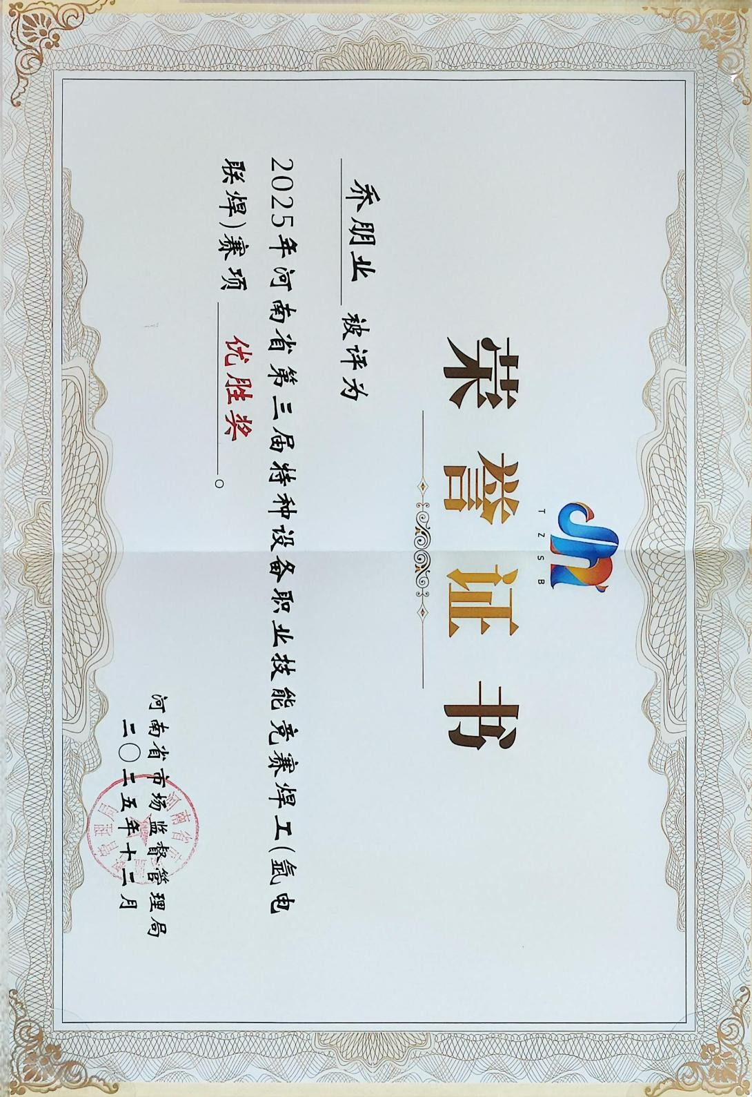 弧光淬炼真功 匠心铸就荣耀 ——我司乔朋业荣获河南省特种设备职业技能竞赛优胜奖