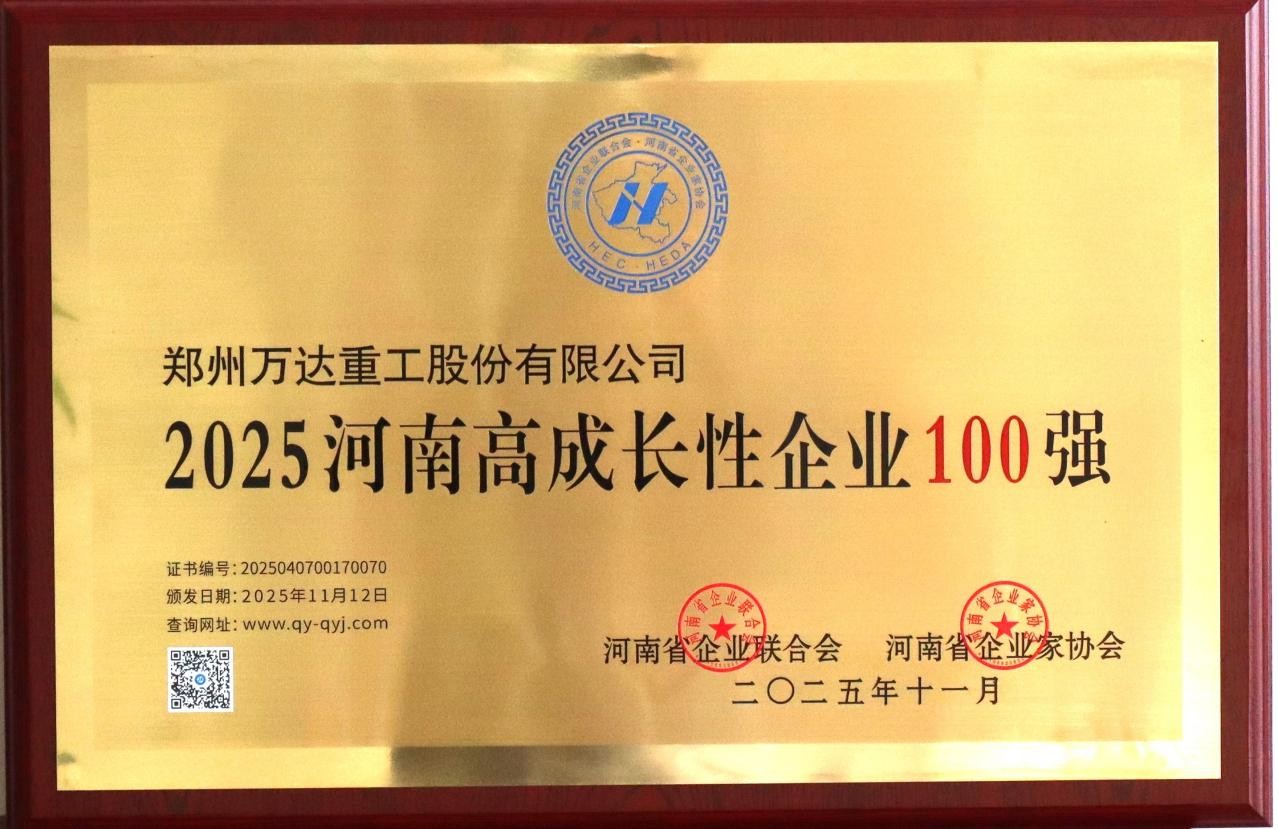 热烈祝贺郑州万达重工股份有限公司连续荣获2025河南省高成长性100强企业